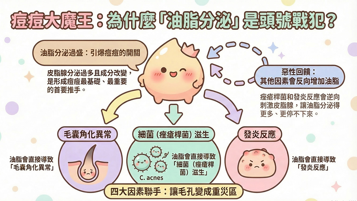 青春痘(痤瘡)反覆發作的根本原因在於皮脂腺過度活躍。當油脂分泌過盛時,會進一步導致毛孔堵塞,成為細菌(痤瘡桿菌)滋生的溫床,進而引發慢性發炎,形成紅腫膿皰。若不從源頭控油,痘痘問題就難以斷根。