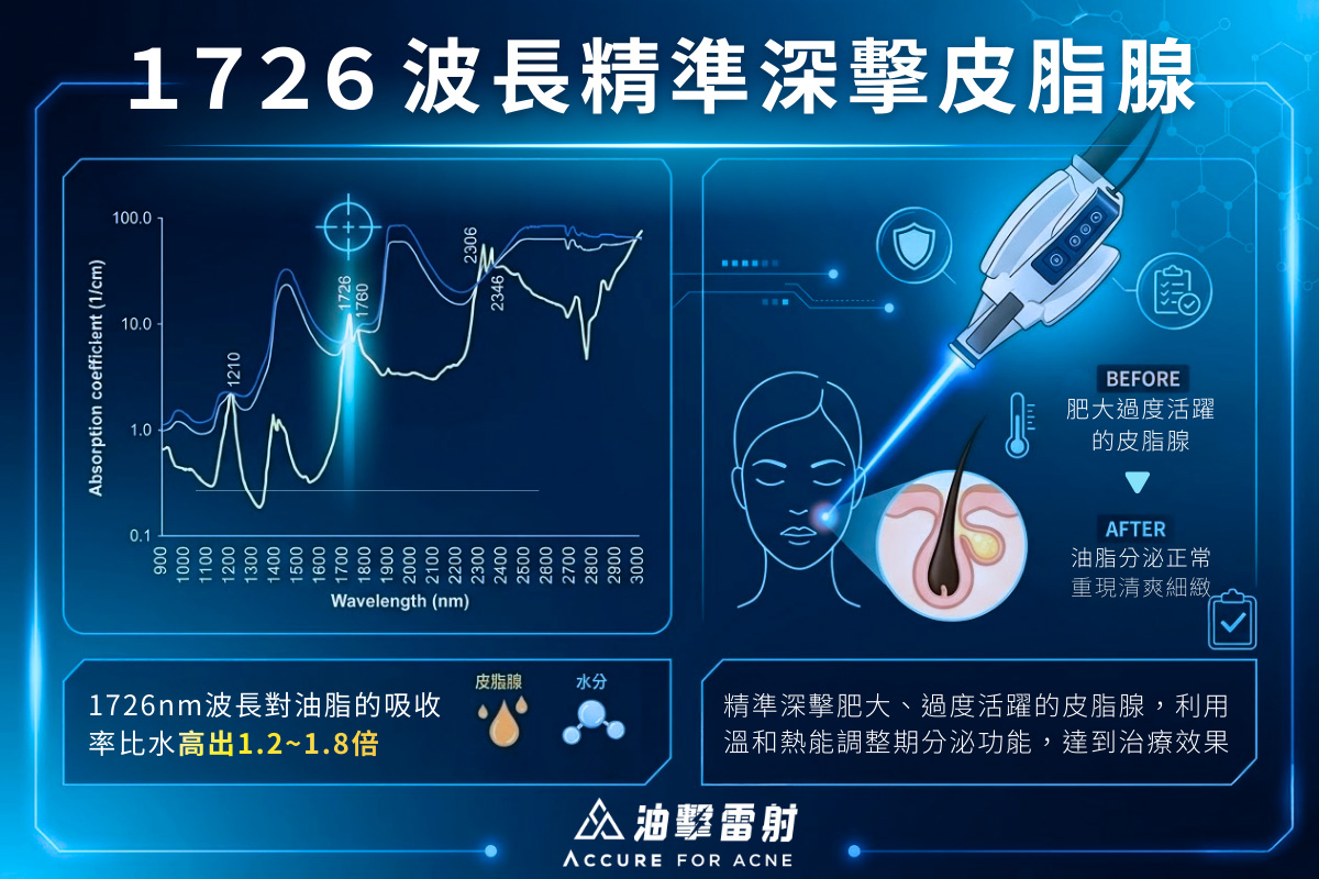 專為皮脂吸收峰值設計,1726nm 波長對油脂的吸收率比水分高出 1.2 至 1.8 倍。這意味著熱能可以精準鎖定肥大活躍的皮脂腺,利用溫和熱能調整其分泌功能,而不傷及周邊組織。