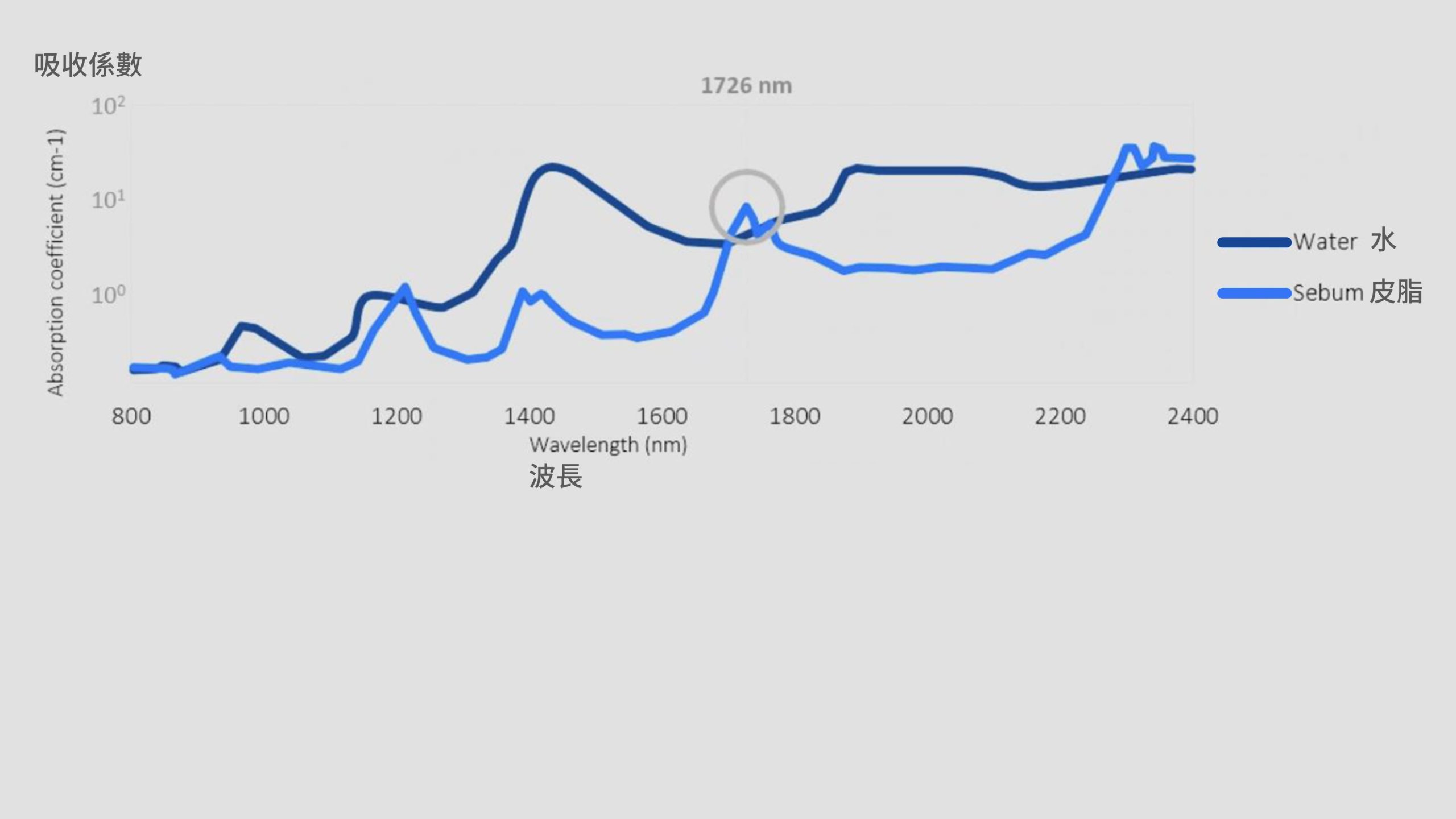 那皮脂腺有沒有屬於它自己的吸收高峰?答案是有的!觀察吸收曲線可以發現,在 1726 nm 這個波長的地方,皮脂的吸收比稍微高過水一點點。