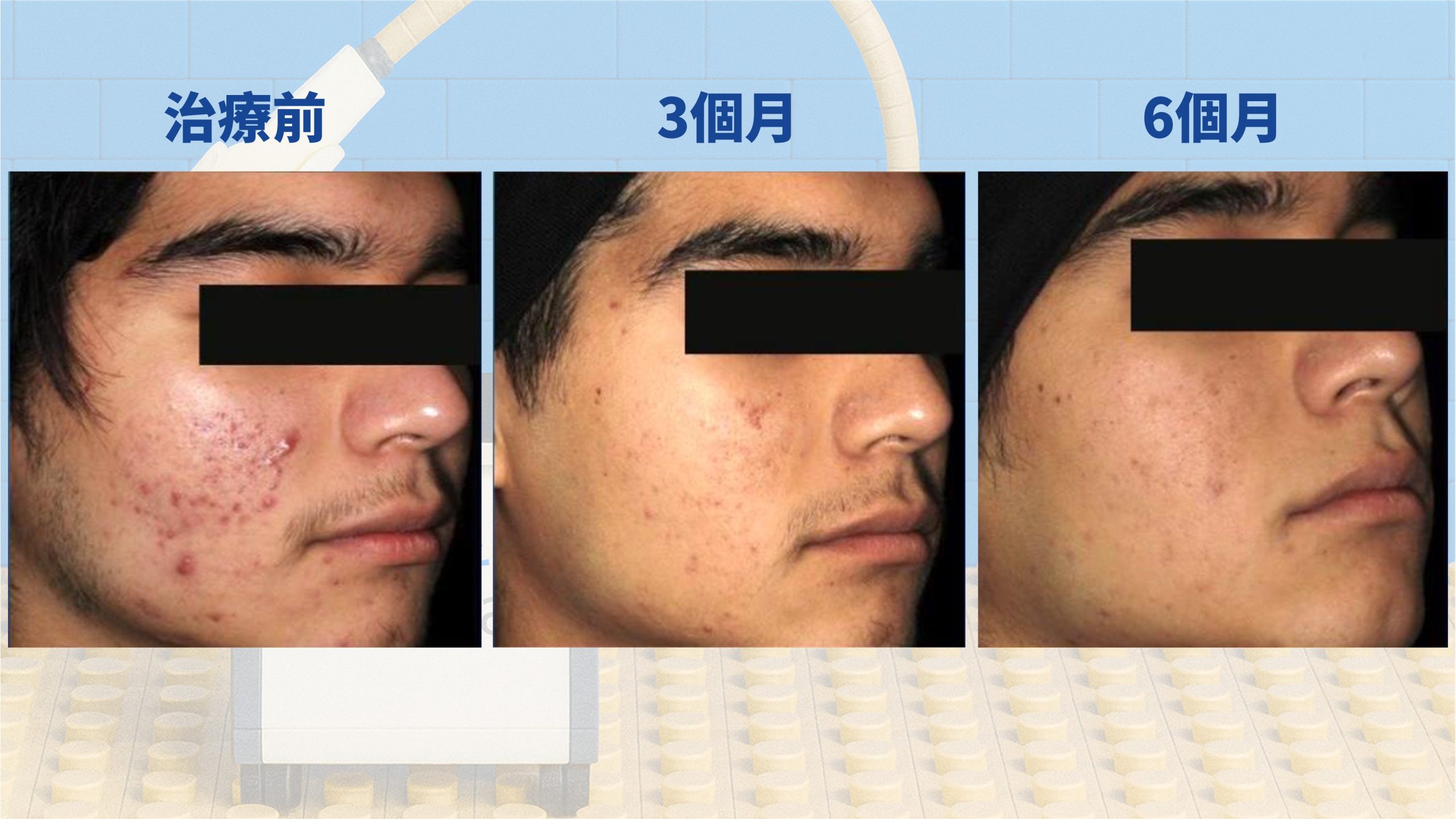 • 顯著改善:中等嚴重程度的痘痘患者,在僅接受雷射治療(無口服A酸、無擦藥)且完成三次療程後,痘痘幾乎消退。