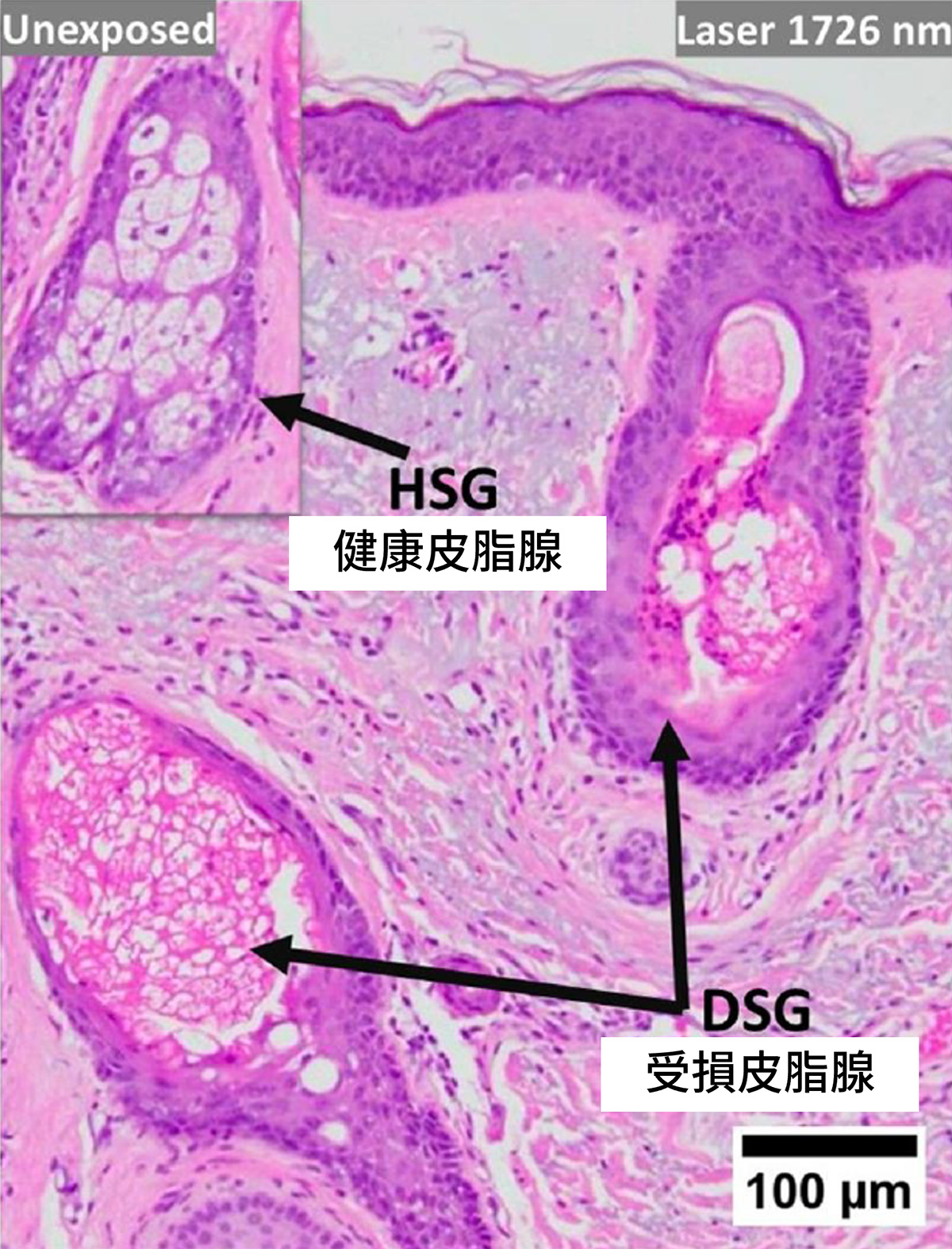 在顯微鏡下觀察,經過 AviClear 施打後的皮脂腺會呈現明顯的破壞與碎裂。當皮脂腺被破壞,油脂分泌自然減少,也就解決了痘痘成因中最重要的一個因素。