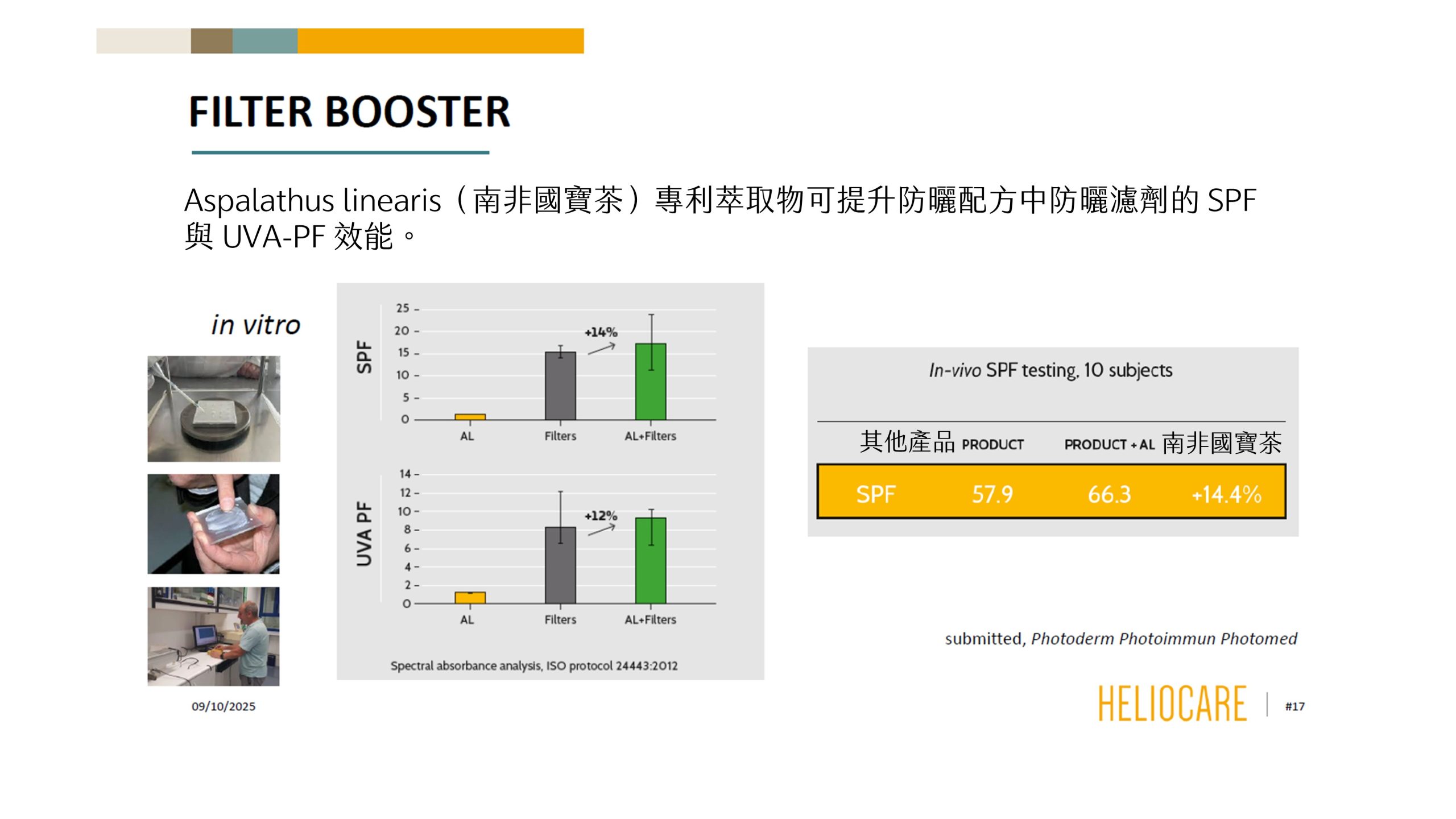 想像一下,您的防曬乳液本來只有 SPF 50 的保護力,加入 ASPA 後,其有效防禦力將再往上提升一截。實驗結果顯示,ASPA 能將 SPF 值提升約 14%,同時也增加了對 UVA 的防禦。