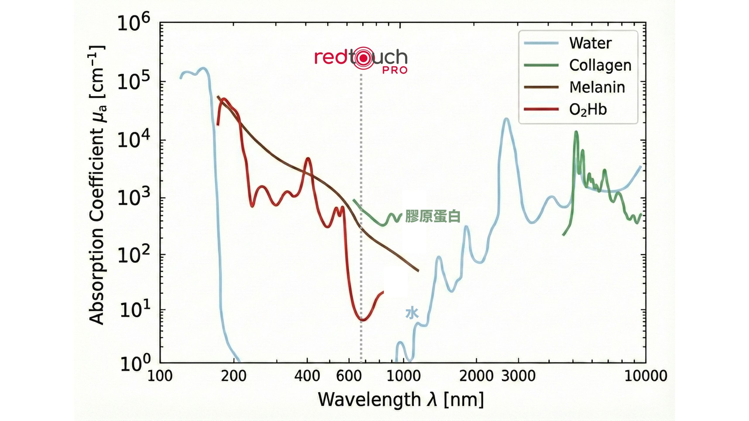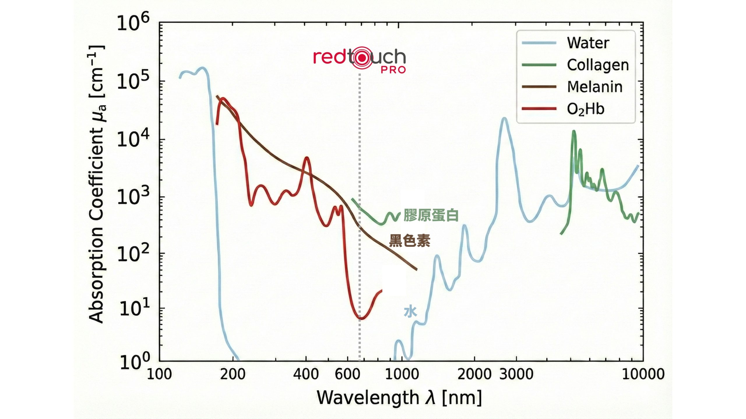 市面上的電波拉皮也是透過加熱來刺激膠原蛋白,但其原理是利用水分子震盪產熱,再間接加熱膠原蛋白。然而,675 nm 波長的吸收特性截然不同:
