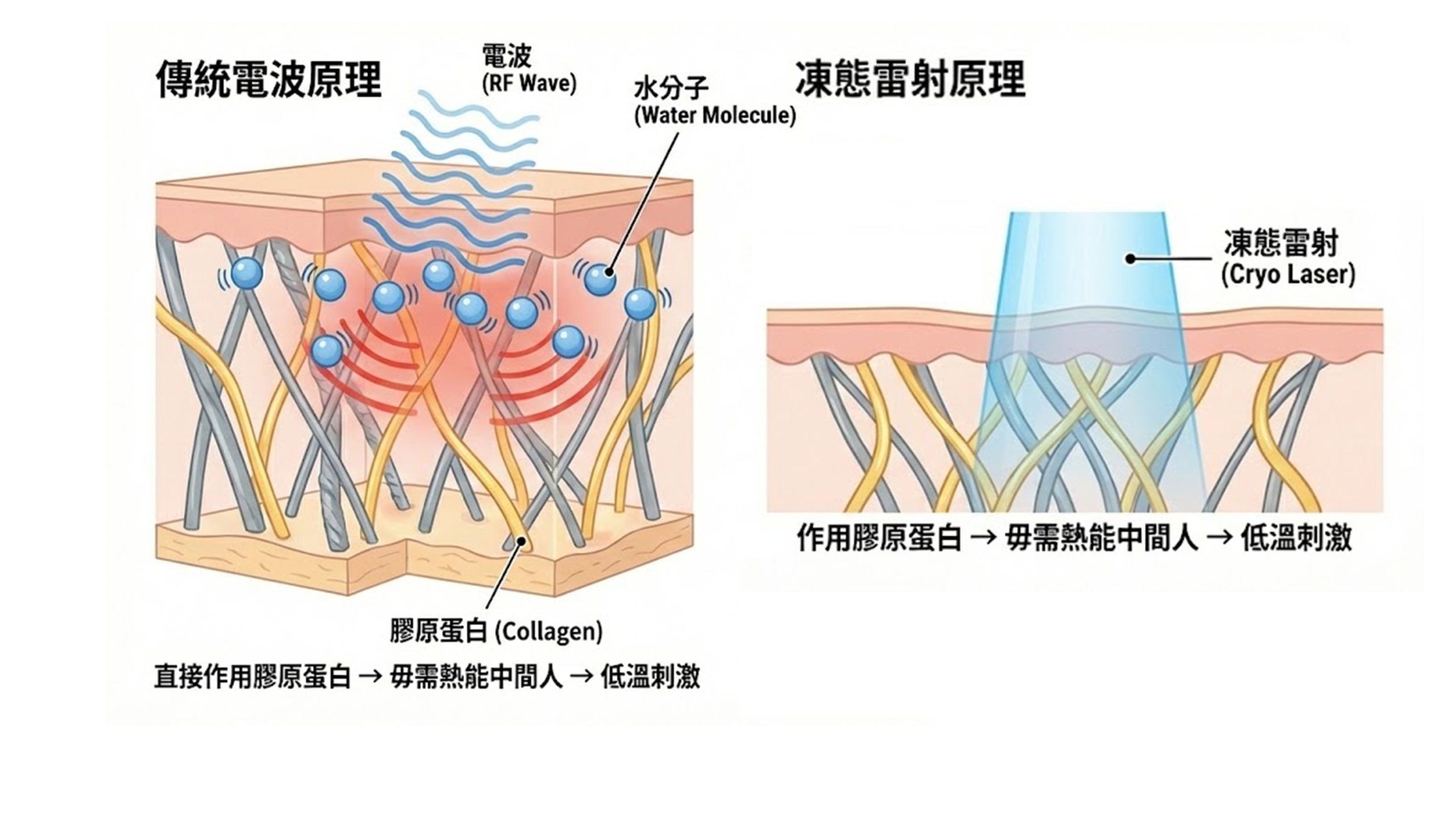 2. 冷回春機制:由於不需要將皮膚加熱至高溫,且探頭接觸皮膚時維持在 5°C,治療過程僅有微刺感,幾乎無痛。相較於電波的「熱回春」,凍態雷射屬於副作用極低的冷回春