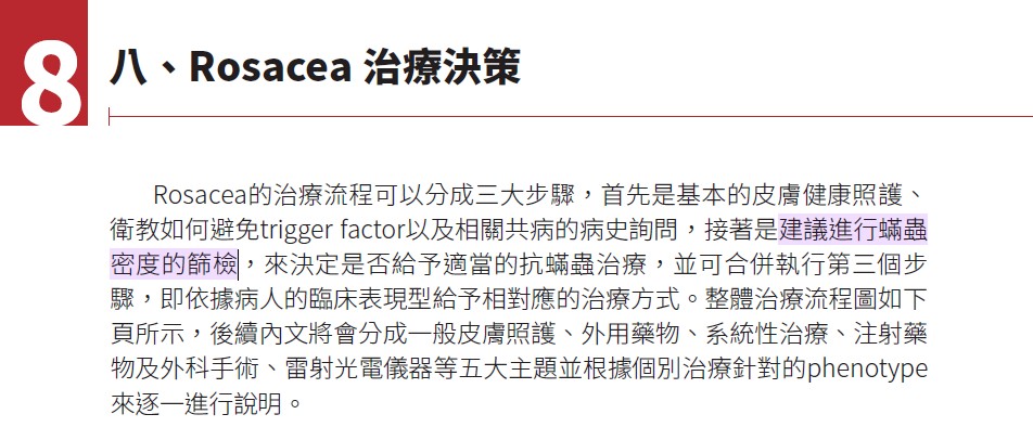 我之前有參與台灣皮膚科醫學會,有關酒糟的共識會議。目前大家的共識,會把蠕形蟎蟲的檢查,列在第一個步驟。