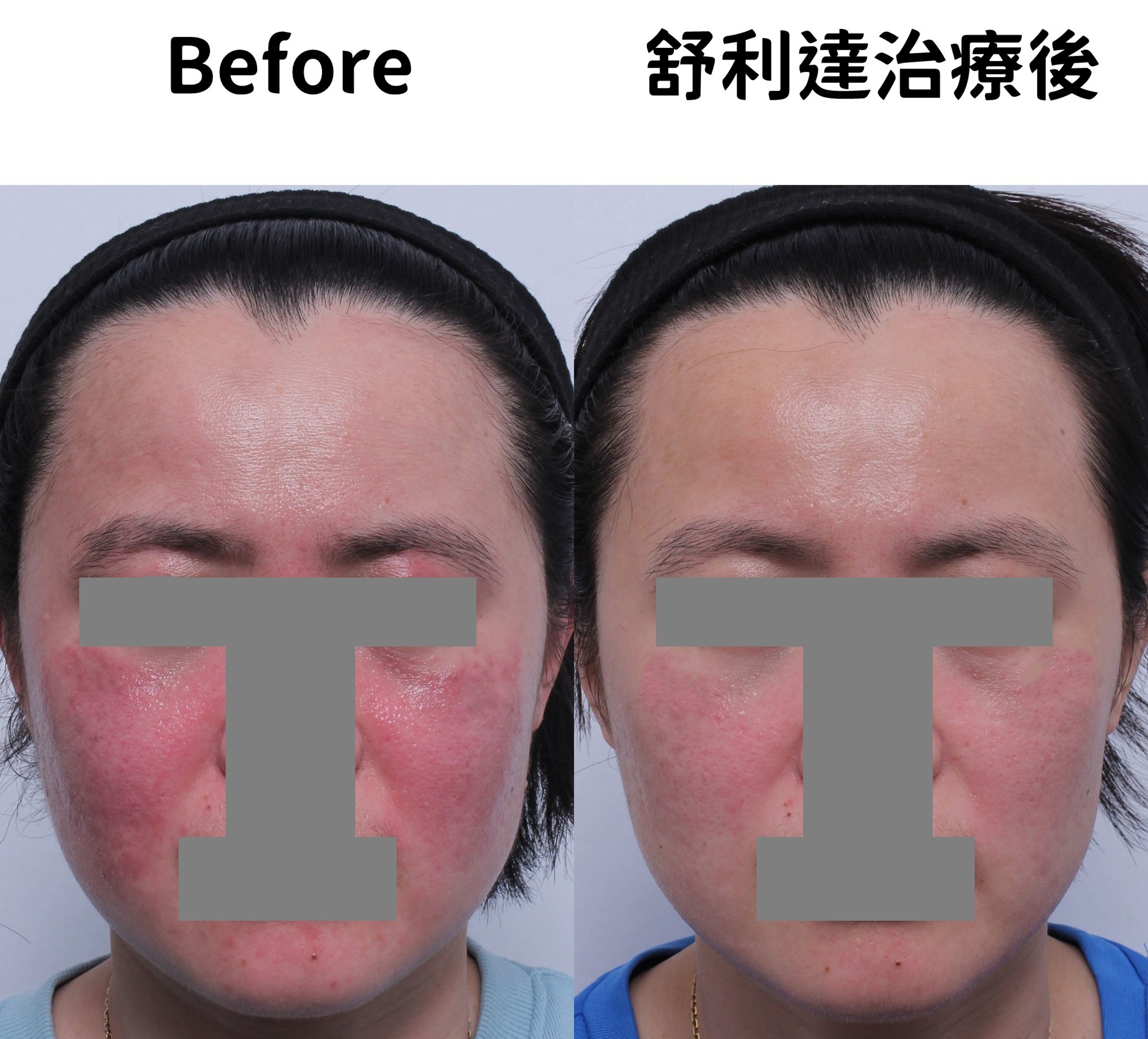所以你把她最近的狀況,和一開始臉紅的狀況比較,真的是差蠻多的。當然,有的酒糟患者,因為體質的關係,在一、兩年後,蠕形蟎蟲的數量可能會再高回來,這時候只要再重新使用舒利達,很快就可以把蟲量降低,讓臉回到穩定的狀態。