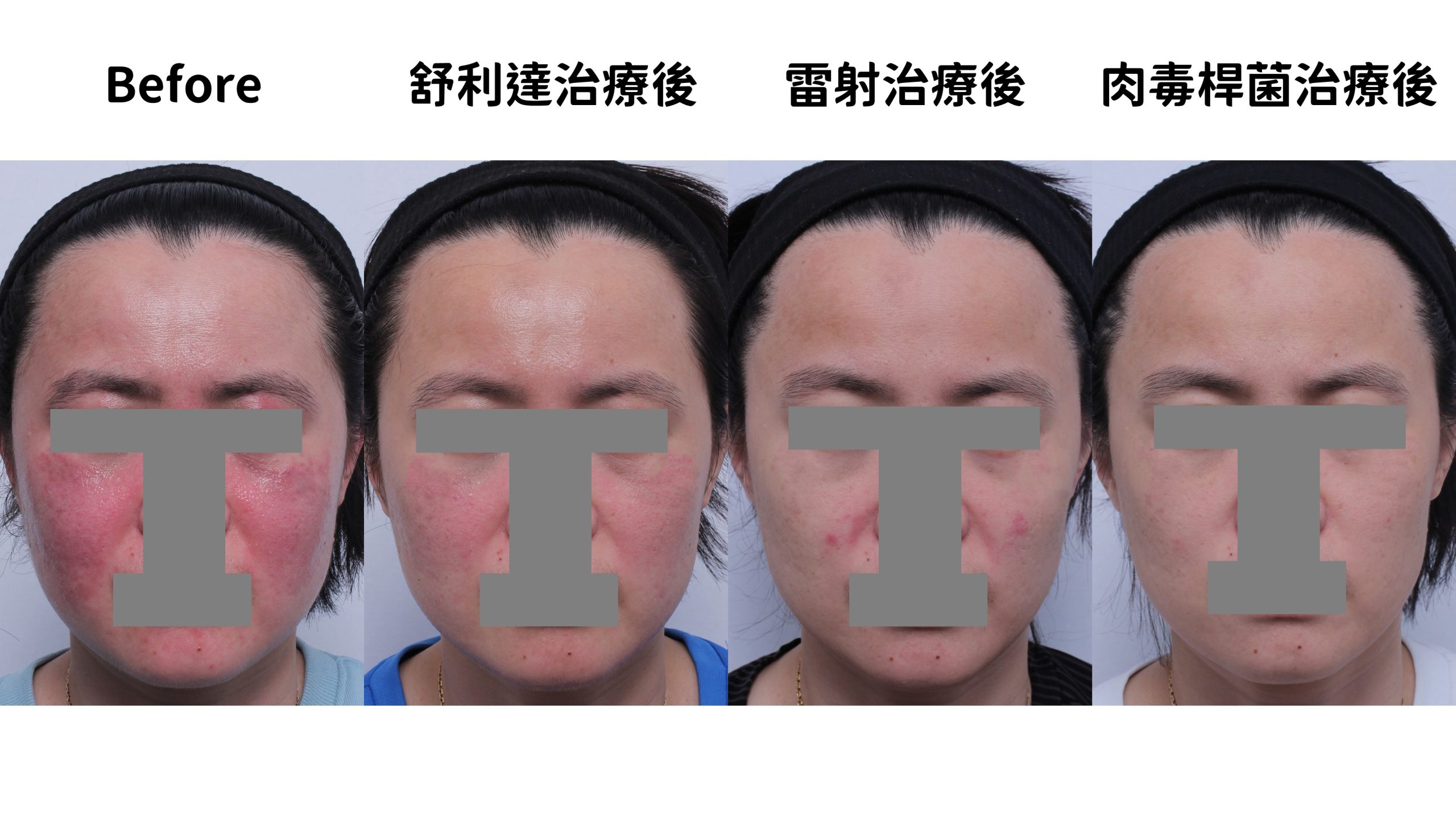 面對這樣嚴重的臉部紅腫,你可能會想:「為什麼不立刻使用最強的治療方式呢?像是馬上打個染料雷射退紅,或是有一些醫師提到的直接注射肉毒桿菌素呢?」